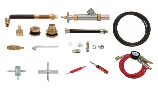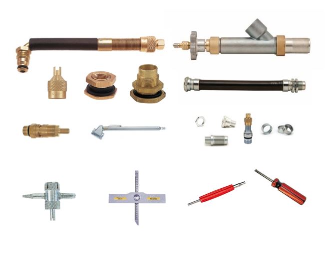 - Valve - Valve Extension - Valve core, cap and adapters - O-ring - Bore tools - Inflators - Gauges